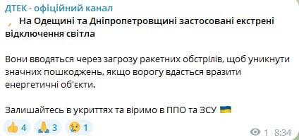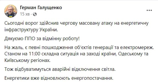 Агресор здійснив пуски крилатих ракет повітряного та морського базування, зенітних керованих ракет до ЗРК С-300 по об’єктам енергетичної інфраструктури нашої країни.