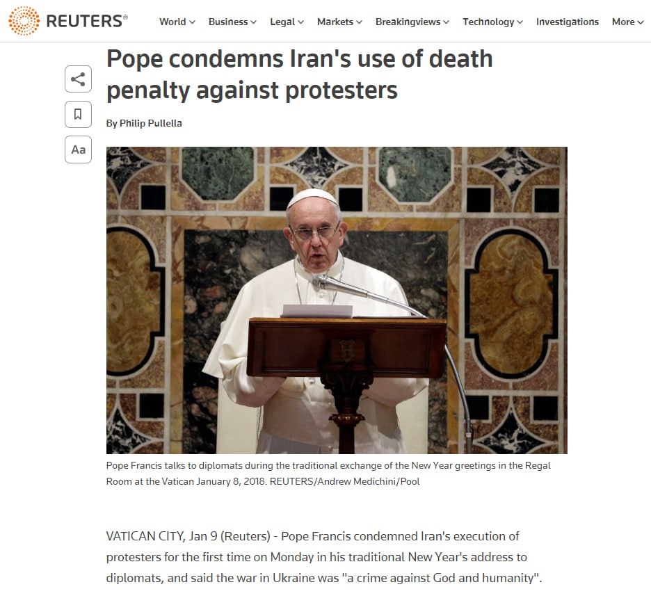 Папа также цитировал конституцию Ватикана, сказав, что «любой акт войны, направленный на неизбирательное уничтожение целых городов или огромных территорий с их жителями, является преступлением против Бога и человечества, которое заслуживает жесткого и однозначного осуждения».