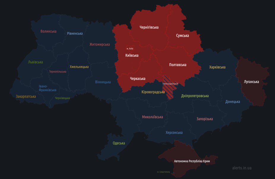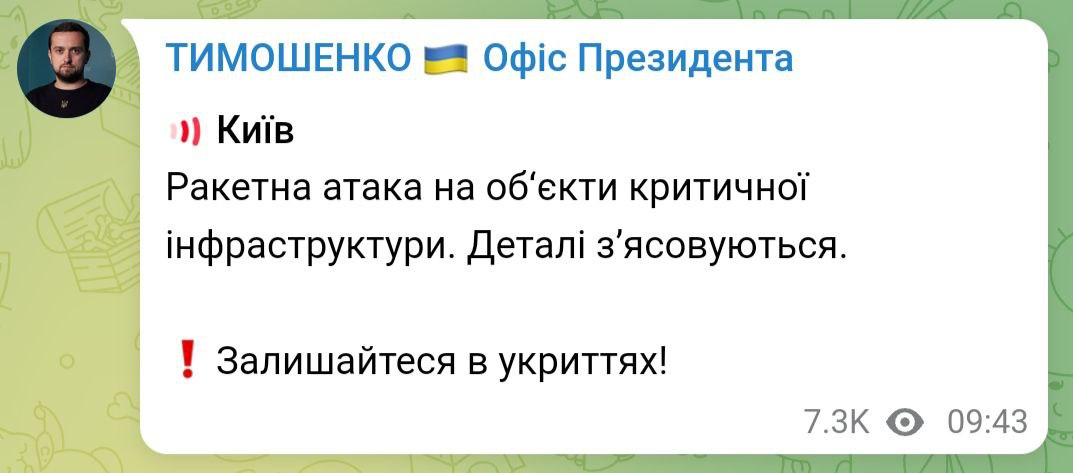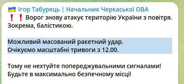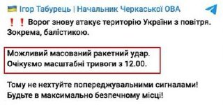 Head of Cherkasy Regional Military Administration warns of possible large-scale alarm from 12:00 and possible massive missile attack