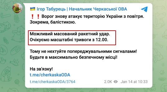 ❗Голова Черкаської ОВА попереджає про ймовірну масштабну тривогу з 12:00 та ймовірний масований ракетний удар