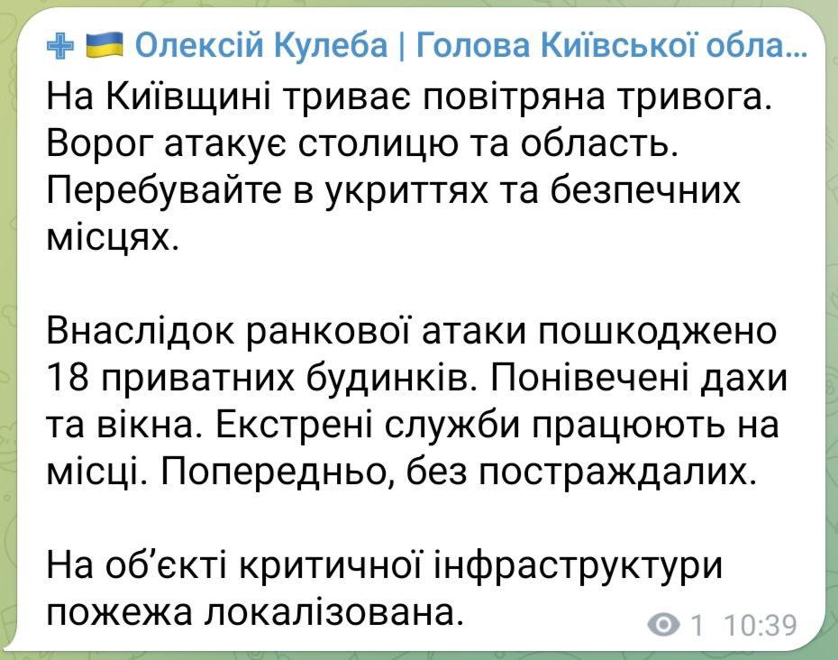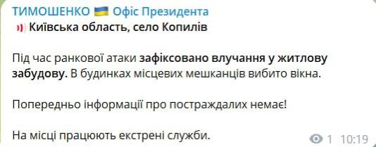 У Київській області в селі Копилів під час ранкової атаки зафіксовано влучання в житлову забудову, там вибіти вікна. Попередньо, постраждалих немає