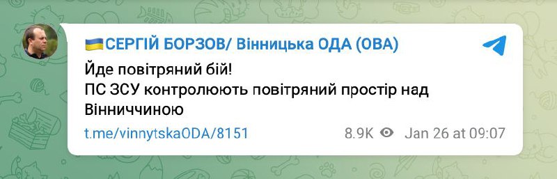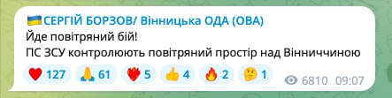 ❗️Йде повітряний бій, ПС ЗСУ контролюють повітряний простір над Вінниччиною, — очільник ОВА Сергій Борзов.
