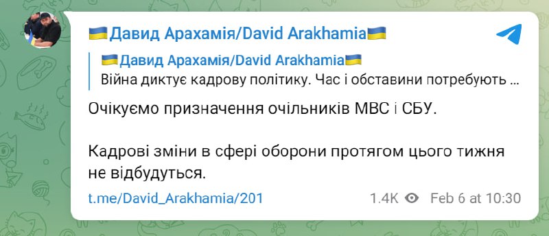 ⚡Кадрові зміни в сфері оборони протягом цього тижня не відбудуться, - Арахамія