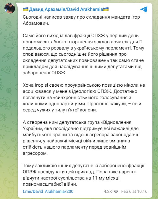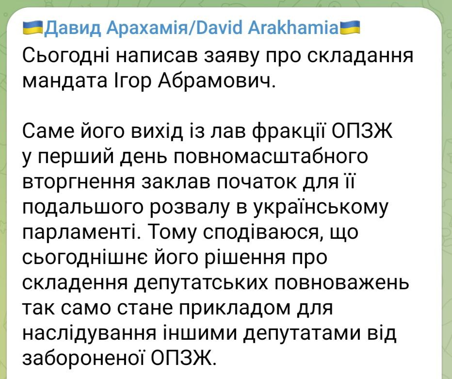 Arakhamia announces that Igor Abramovich resigns his mandate
