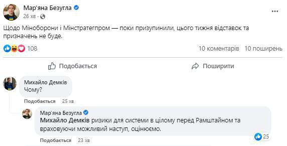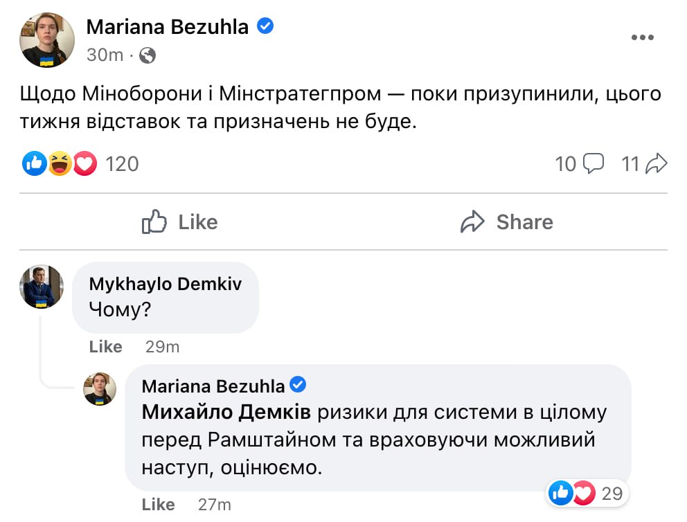 MP Honcharenko also notes that there will be no changes in the Defense Ministry: "Reznikov will not be replaced this week. According to the law, the Minister of Defense cannot be a military man."