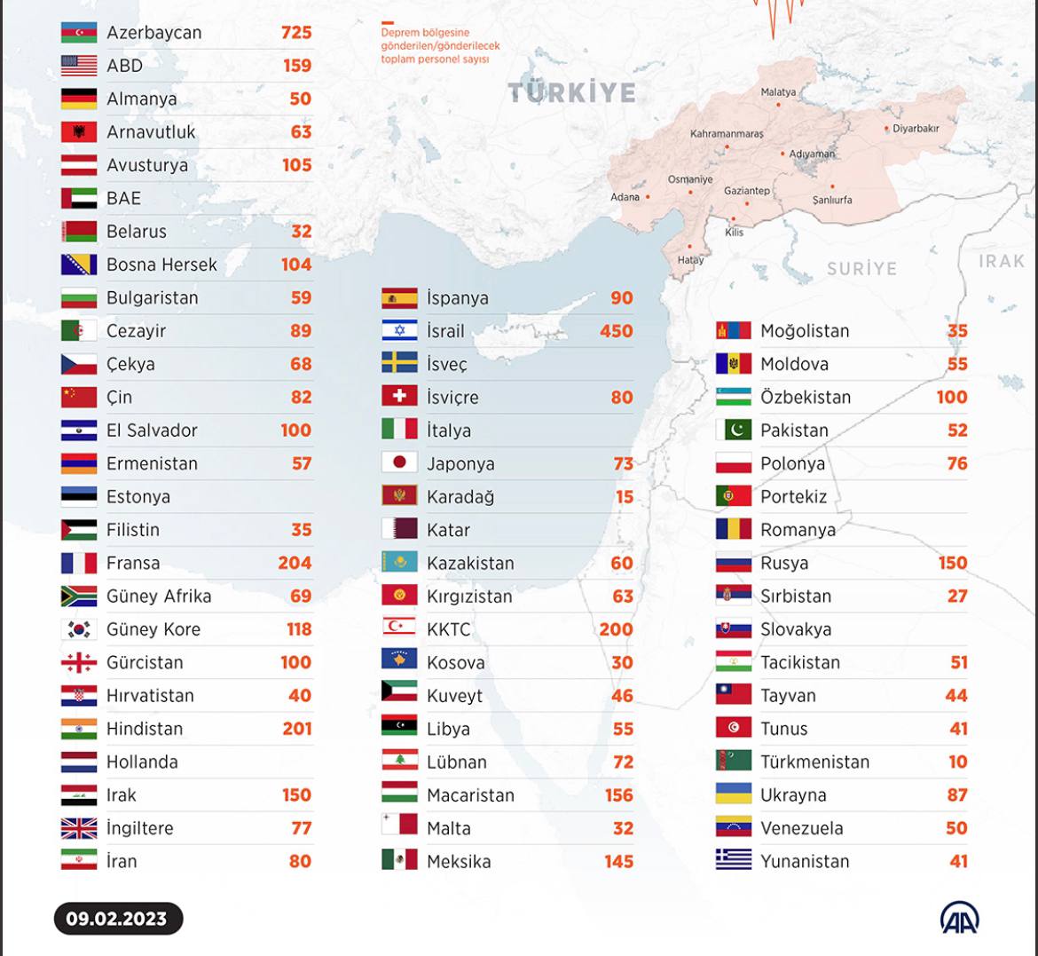 Azerbaijan, Israel, and France sent the largest group of rescuers to Turkey out of 61 countries.