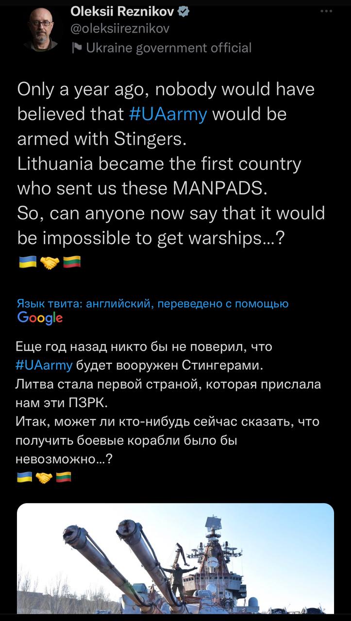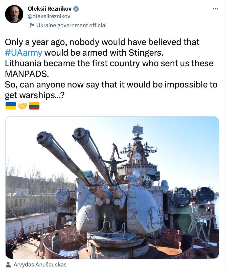 Перебуваючи сьогодні в нашому місті, глава відомства пояснив: «Щоб ризикувала саме Одеса, росіянам треба панувати на Чорному морі, а ми позбавили їх цієї можливості. Ви знаєте: після застосування наших українських «Нептунів» крейсер «Москва» пішов за відомою всім адресою.