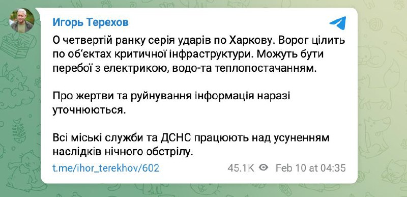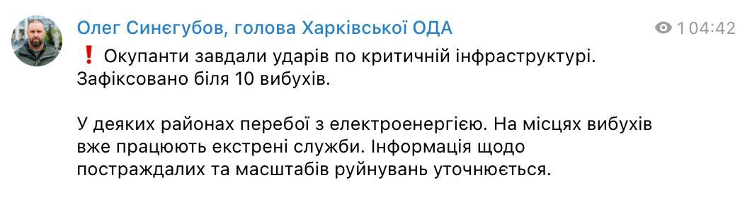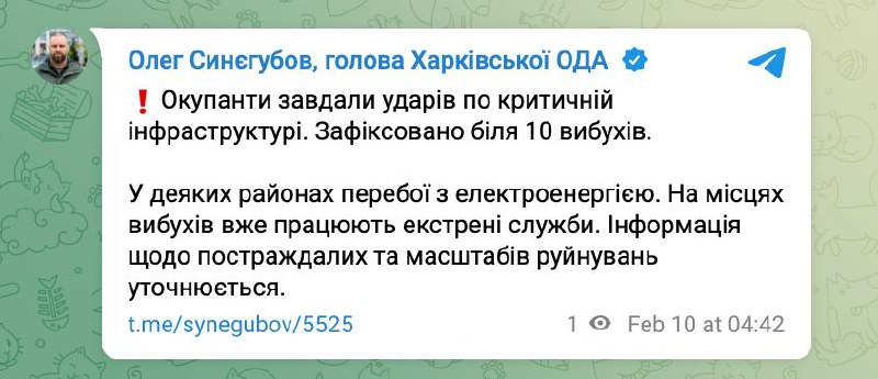 Уночі росіяни також обстріляли об’єкти критичної інфраструктури в Харкові — зафіксовано 10 вибухів. У місті можливі перебої з електрикою, водо- та теплопостачанням.