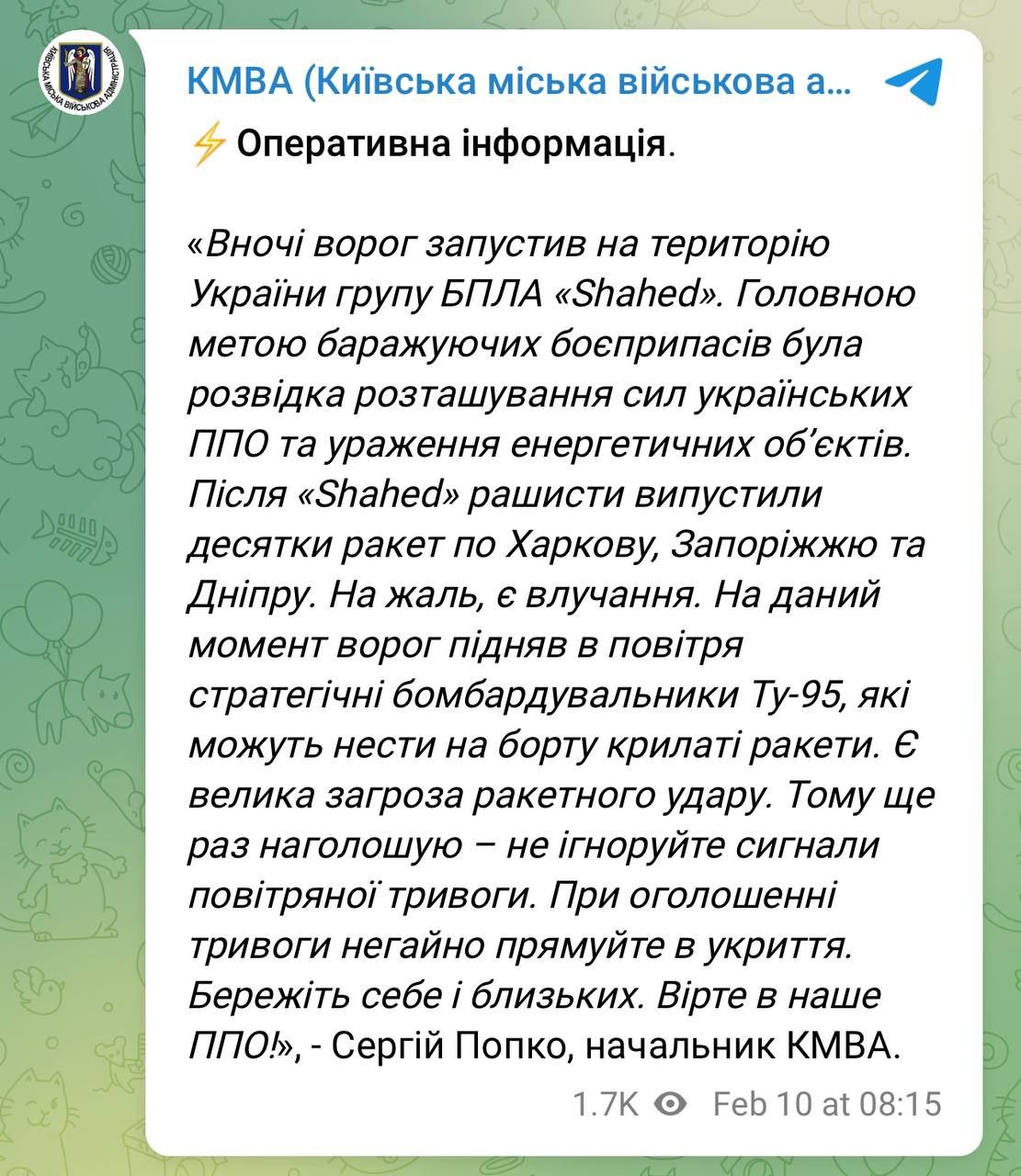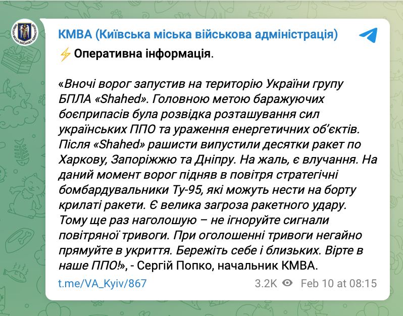 Ворог підняв у повітря стратегічні бомбардувальники Ту-95, які можуть нести на борту крилаті ракети. Є велика загроза ракетного удару, повідомив начальник КМВА Сергій Попко.