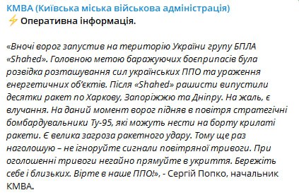 The enemy has launched Tu-95 strategic bombers that can carry cruise missiles. There is a great threat of a missile strike, said Serhiy Popko, head of the KMVA.