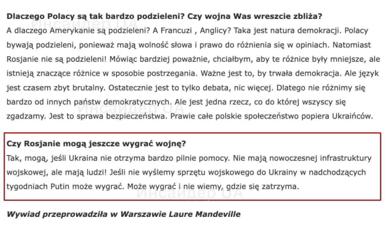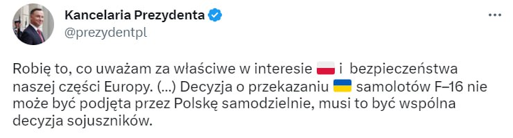Рішення про передачу Україні літаків F-16 не може бути прийняте Польщею самостійно, це має бути спільне рішення союзників — президент Польщі Анджей Дуда.