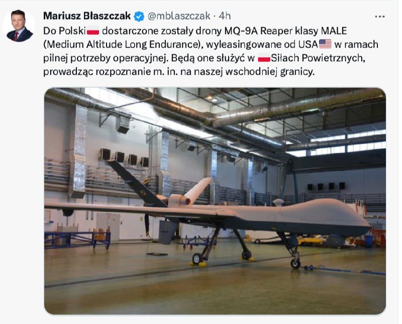 MQ-9A Reaper drones, which the country leased from the United States, have arrived in Poland, says Defense Minister Mariusz Blaszczak.