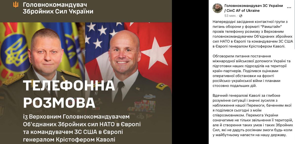 Напередодні засідання контактної групи з питань оборони у форматі “Рамштайн” провів телефонну розмову з Верховним головнокомандувачем Обʼєднаних збройних сил НАТО в Європі та командувачем ЗС США в Європі генералом Крістофером Каволі.