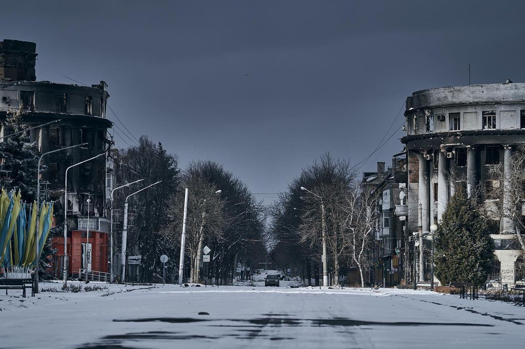 Центр Бахмута сегодня днём. Слышны звуки обстрелов.