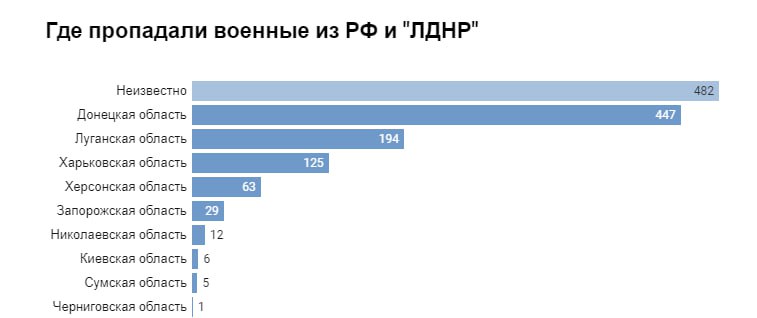 В январе родственники оккупантов опубликовали 850 постов о потере связи с близкими в группах «ВКонтакте» — в 6 раз больше, чем в первый месяц войны. Каждый седьмой пост связан с поиском пропавших ещё весной или летом. Самые серьезные потери несет население оккупированных территорий, где мобилизация началась еще до вторжения. 90 солдат из 350, чьи родственники указали статус военнослужащих, — жители «ЛДНР». Это столько же, сколько пропало контрактников и добровольцев из России — и в два раза больше, чем российских мобилизованных.