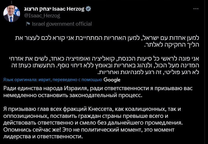 Полиция разгоняла протест водометами. Президент Израиля призвал правительство немедленно остановить процесс принятия судебной реформы.