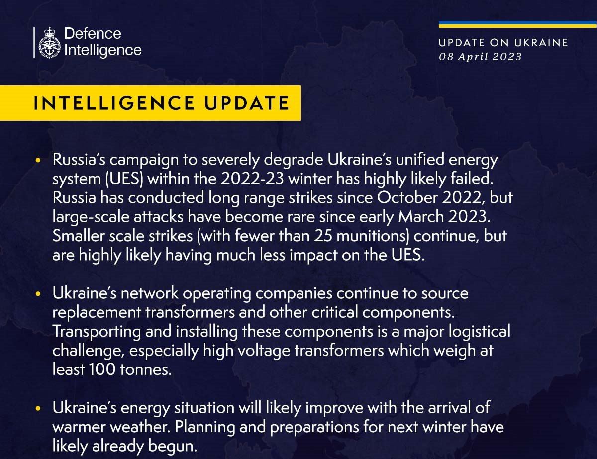 The intelligence notes that Ukraine's grid operating companies continue to search for replacement transformers and other critical components for the power system, but that transporting and installing them presents a logistical challenge, particularly for high-voltage 100-ton transformers.