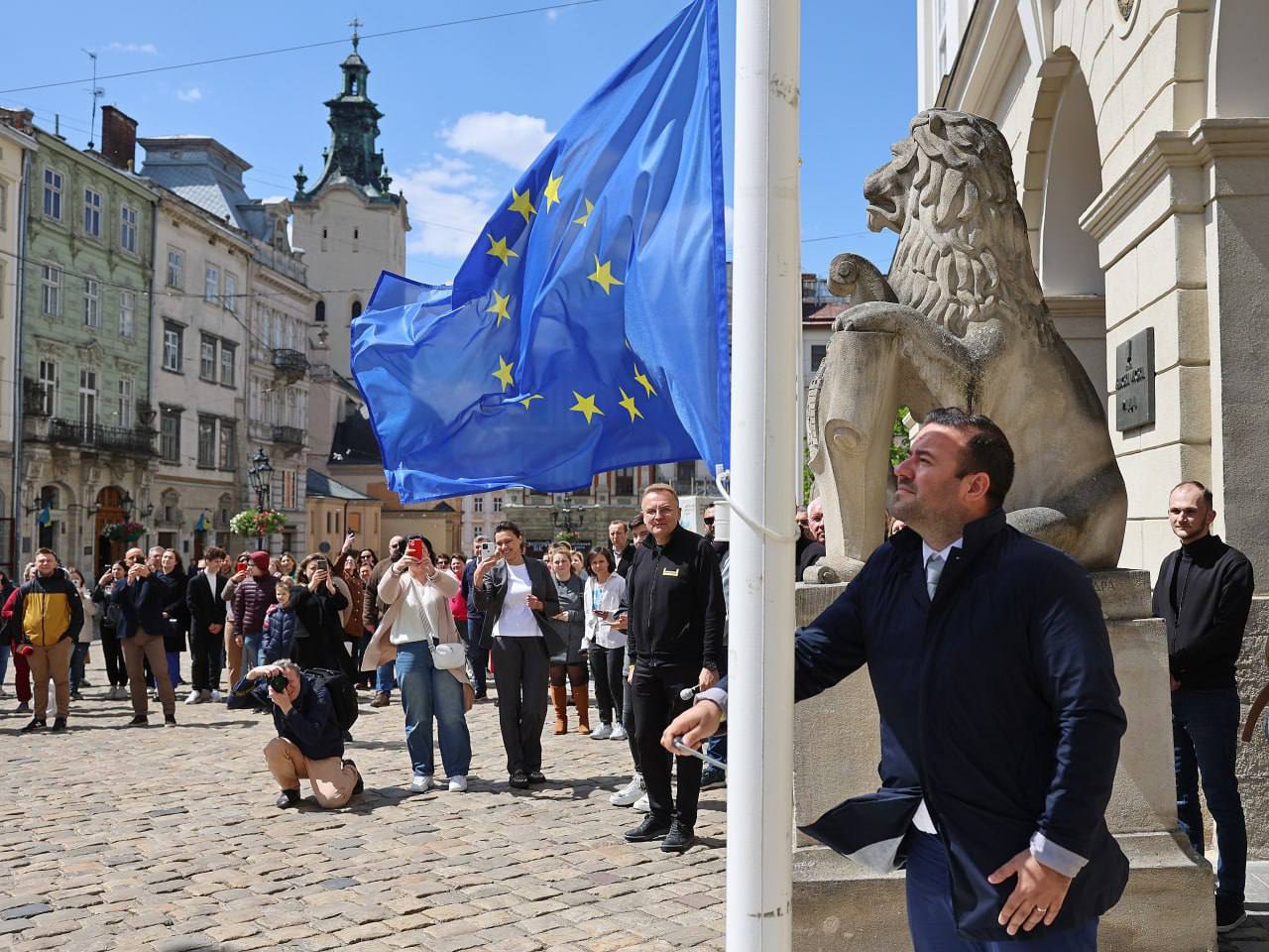 🇪🇺 На Думській площі відбулася урочиста церемонія підняття прапору Європейського Союзу. Церемонія пройшла в рамках відзначення Дня Європи.