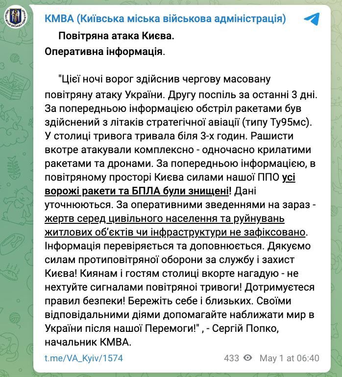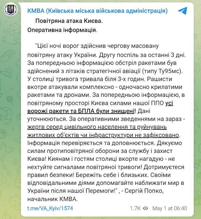 Близько 02:30 ночі 1 травня росіяни атакували Україну 18 ракетами із літаків стратегічної авіації. Українські сили ППО знищили 15 з них.