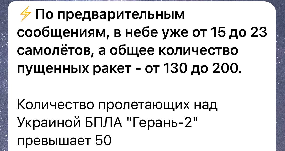 Близько 02:30 ночі російські окупанти атакували Україну із літаків стратегічної авіації – дев’яти Ту-95 з району Оленєгорськ (Мурманська обл.) та двох Ту-160 із району Каспійського моря.