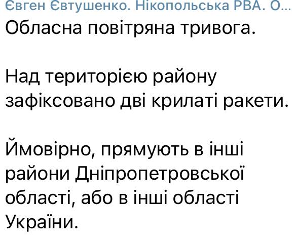 Two cruise missiles spotted over territory of Nikopol district - RPA