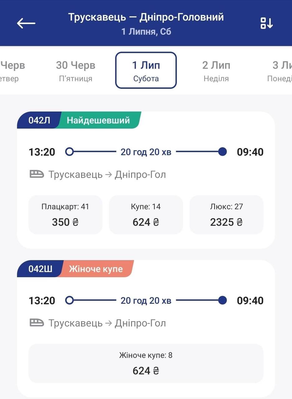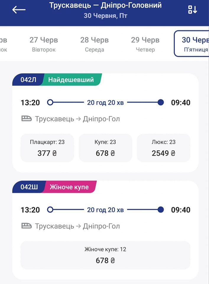 In the train №42 Truskavets-Dnipro for June 30 female compartment is available
