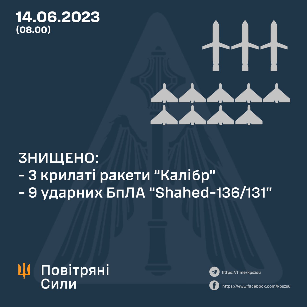 ⚡️Цієї ночі знищено 3 ракети "Калібр" і 9 "Шахедів".