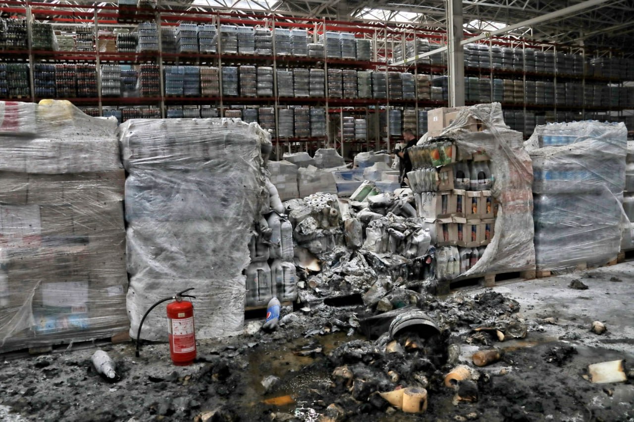 A rocket hit a warehouse, causing damage to 1,000 square meters and a fire.