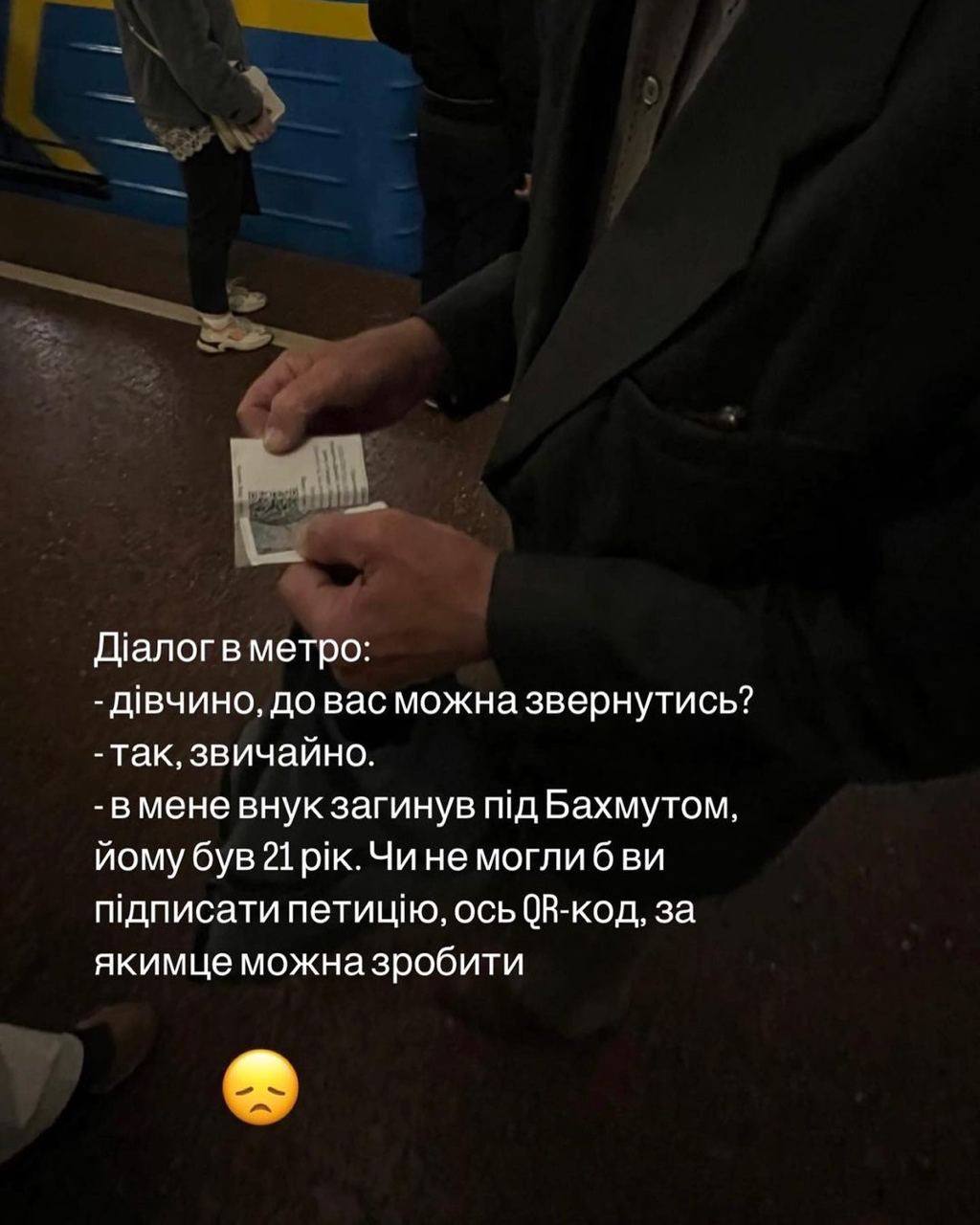 «Чи знали колись наші бабусі й дідусі, що будуть ходити і просити незнайомих людей підписати петицію посмертно своїм онукам. Напевно, ні… Страшний час», - написала в Інстаграм Христина Стецик, яка стала свідком цієї історії.