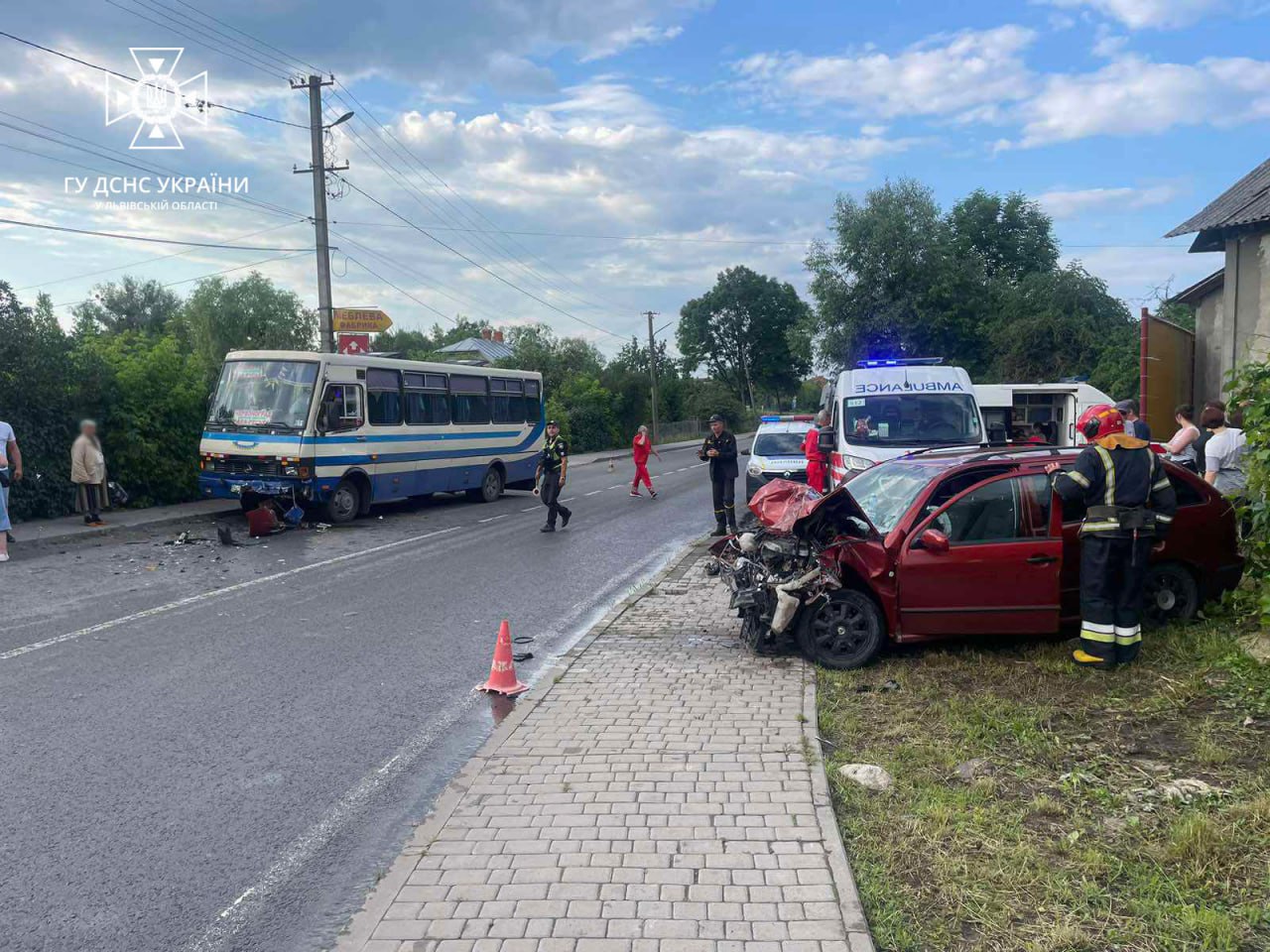On the evening of June 25, at 18:39, rescuers received a report that a Skoda Fabia and an ETALON bus had collided on the Kovel-Zhovkva highway in the town of Velyki Mosty on Lvivska Street. This was reported by the press service of the State Emergency Service in Lviv region.