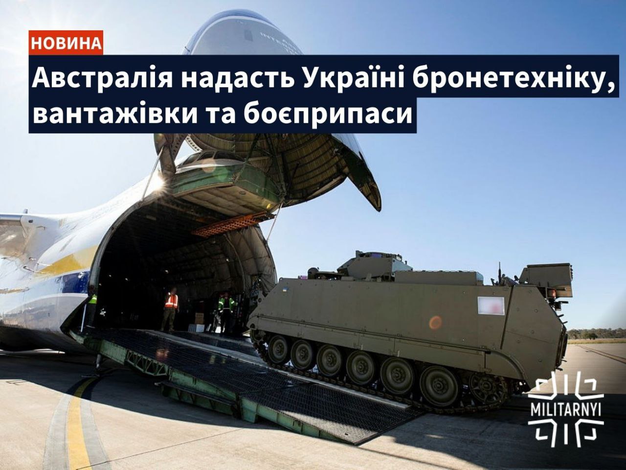 Австралія відправить в Україну 70 військових автівок, у тому числі 28 броньованих машин М113, 14 автівок спеціального призначення, 28 середніх вантажівок MAN 40M та 14 причепів. Також передадуть артилерійські боєприпаси калібру 105 мм.