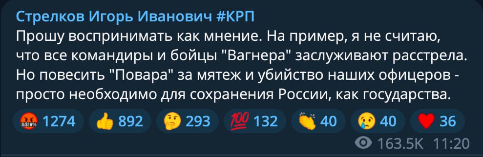 Говорит, что уголовное дело на Пригожина закрыли для того, чтобы не допустить гражданской войны. И вообще ради путинской «стабильности» не грех и закон нарушить 💩