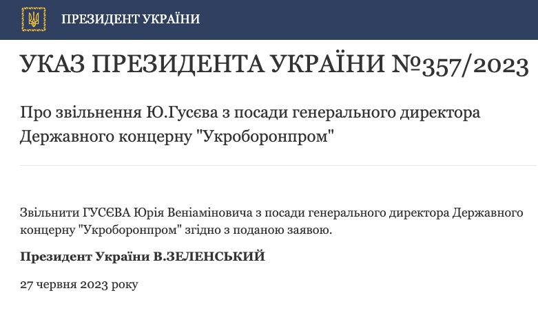 🇺🇦 Президент України звільнив Юрія Гусєва з посади гендиректора «Укроборонпрому»