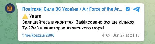 ❗️Зафіксовано зліт 3-х Ту-22м3 з аеродрому Моздок, що у Північній Осетії, вони рухаються у бік акваторії Азовського моря, - ПС