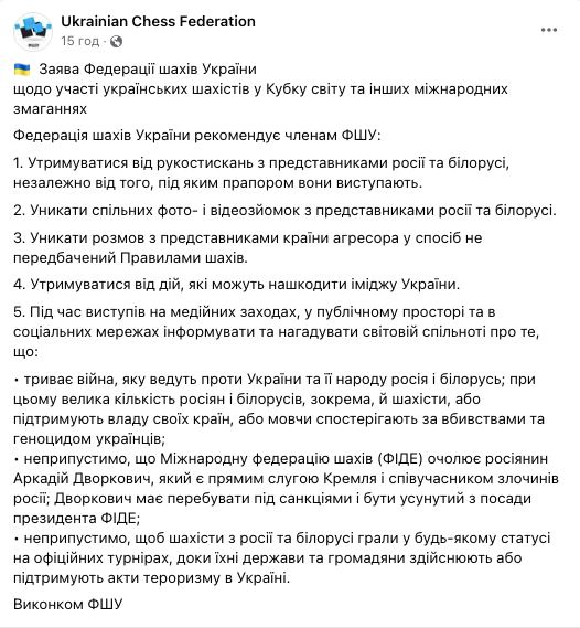 Украинским шахматистам, которые участвуют в международных соревнованиях, рекомендуют не жать руки шахматистам из РФ и Беларуси, - Федерация шахмат Украины