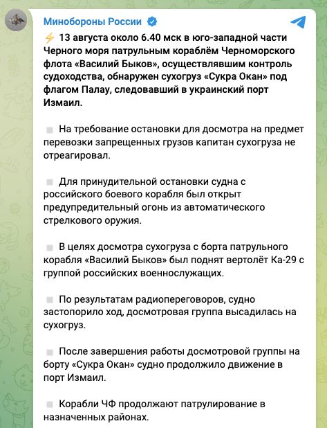 Ну і, окрім того, це інший маршрут, тому що в «зерновій угоді» треба було заходити в Турецьку республіку, потім в Одесу, після чого знов у в Туреччину і вже потім на вихід. Тут такого не буде», – розповів речник ВМС ЗСУ Дмитро Плетенчук.