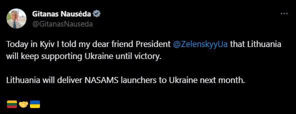 Lithuania will supply Ukraine with NASAMS launchers next місяця🇱🇹