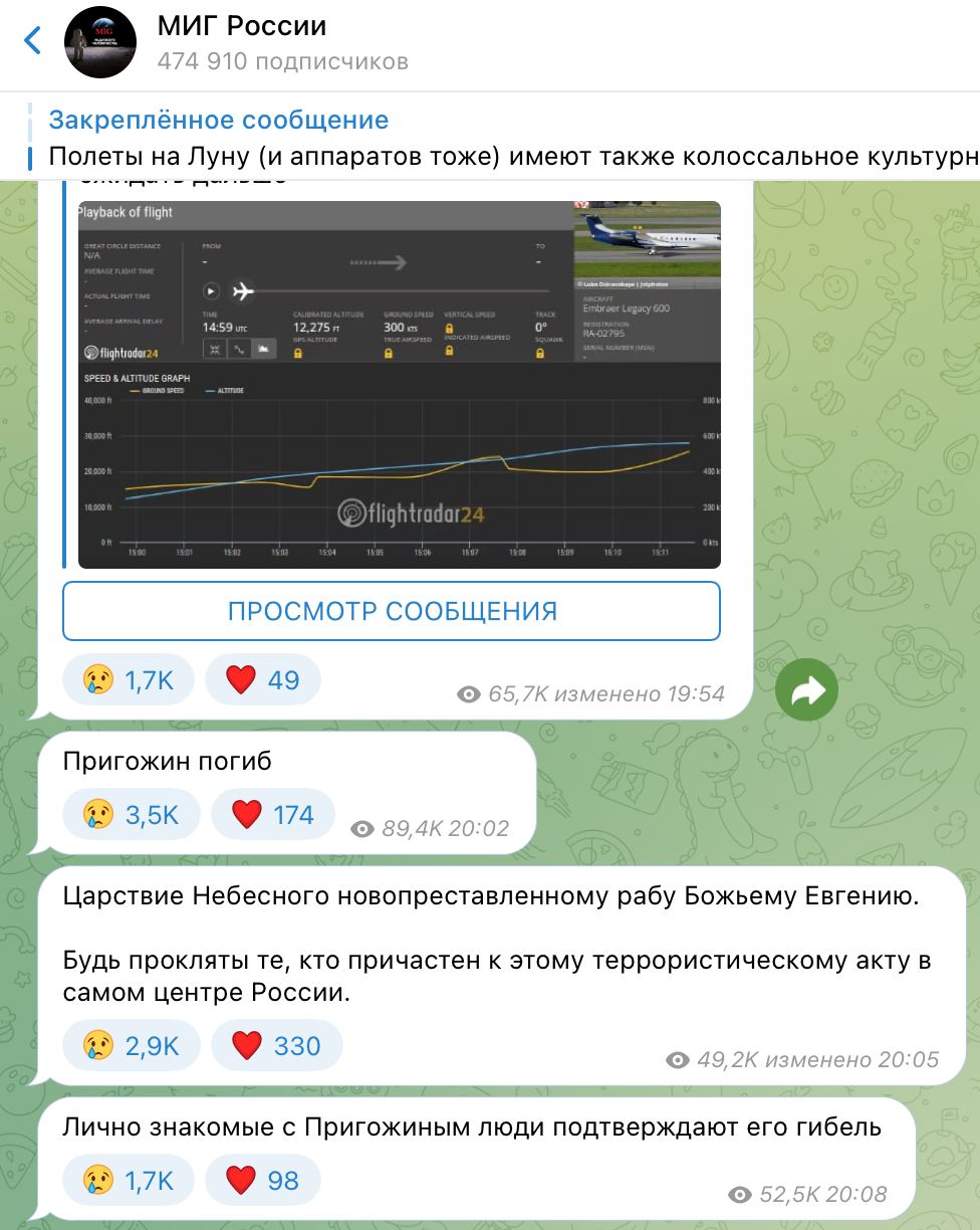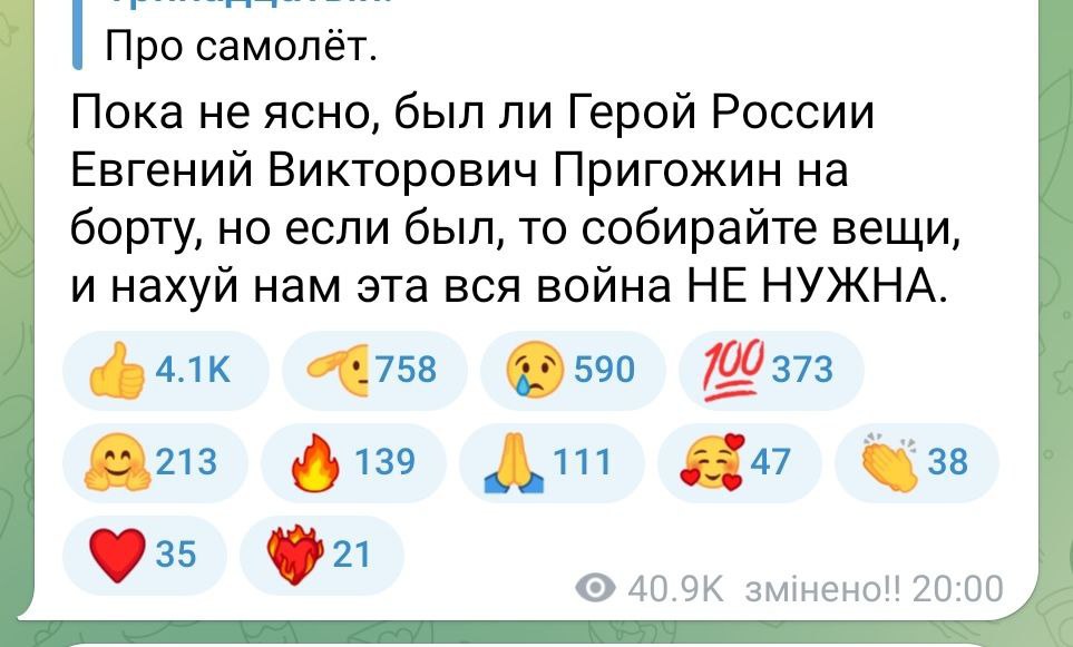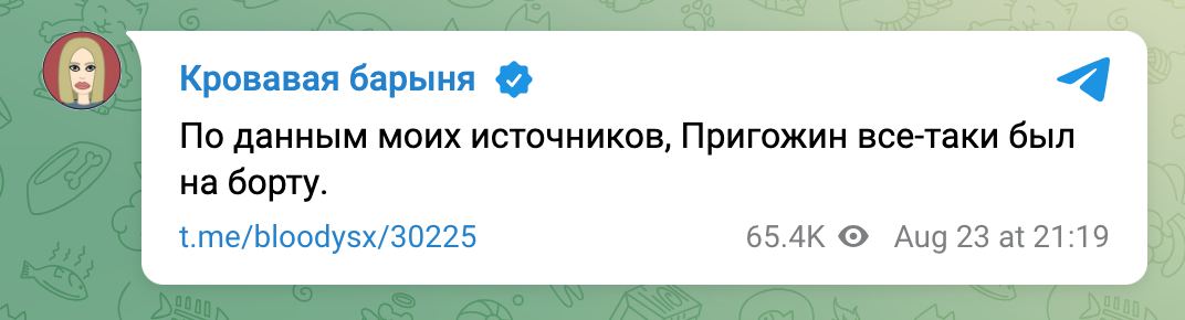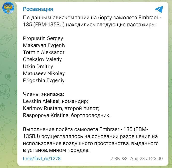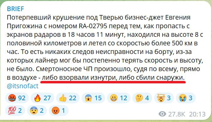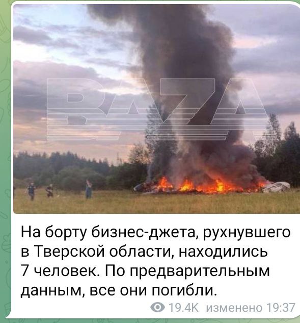 "Putin takes no prisoners" - The Financial Times, citing unnamed officials, claims Prigozhin's plane was shot down by air defense systems