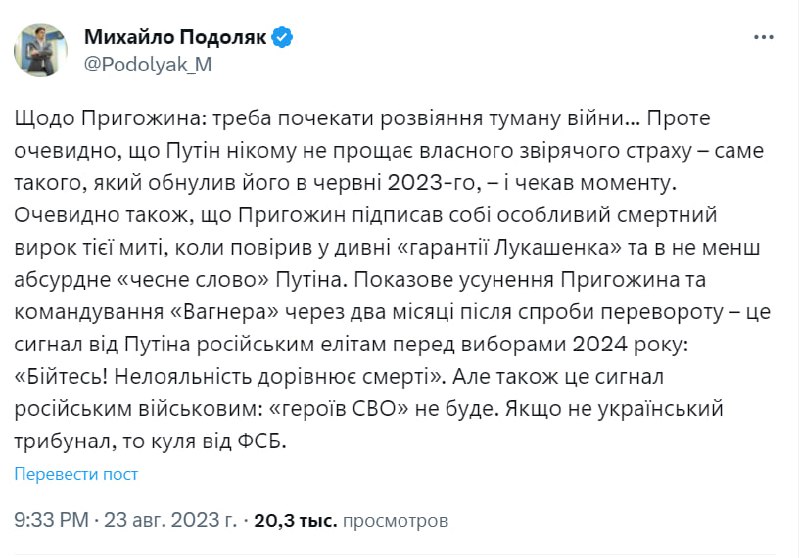 «Путин пленных не берет», - газета Financial Times со ссылкой на неназванных чиновников утверждает, что самолет Пригожина был сбит ПВО