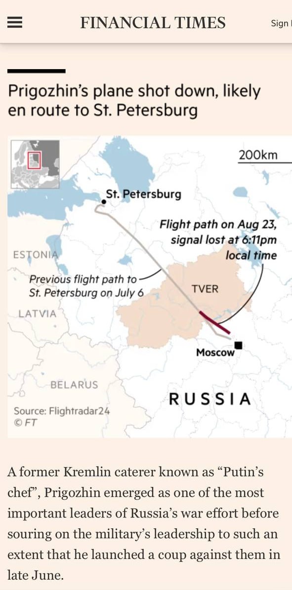 ‼️ The Financial Times confirms, citing Western sources, that Prigozhin's plane was shot down by an air defense missile...