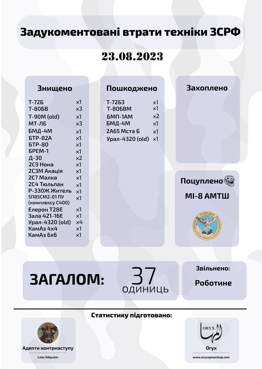 Візуально підтвердженні втрати техніки 21-23 серпня 2023 за підрахунками Oryx в зручному для читання форматі.