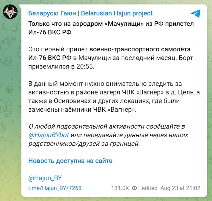 The Il-76 airplane landed at 20:55. Some Russian media report about the possible evacuation of Wagnerians from Belarus to the Russian Federation.