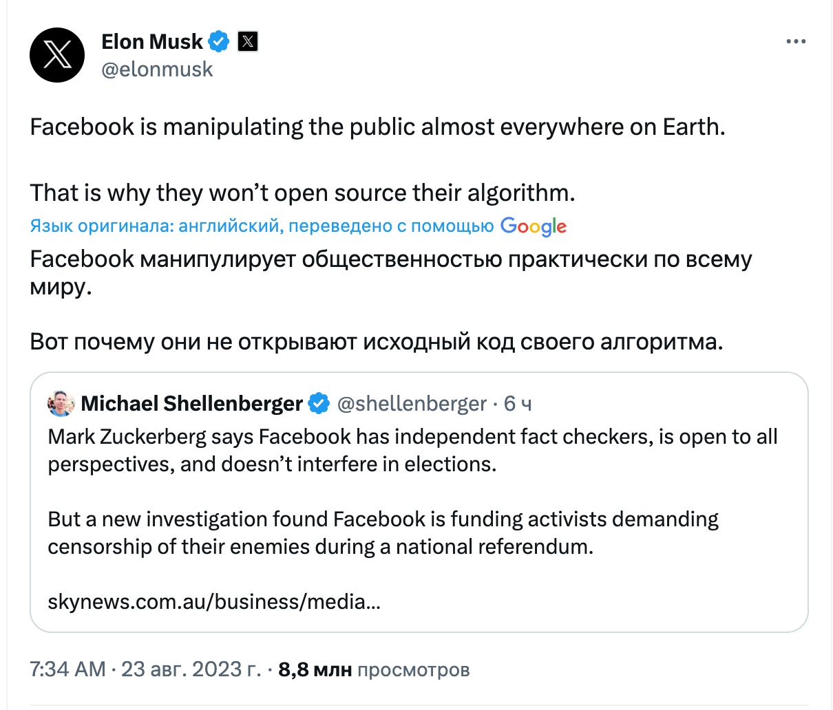 «Facebook манипулирует общественностью практически по всему миру. Вот почему они не открывают исходный код своего алгоритма», — написал Маск в Twitter.