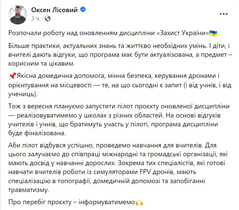 «Больше практики, актуальных знаний и жизненно необходимых умений. Качественная медицинская помощь, минная безопасность, управление дронами и ориентирование на местности - то, на что сегодня есть запрос», - сообщил министр образования Оксен Лисовой.