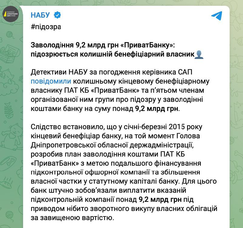 "On September 7, 2023, with the approval of the head of the SAP, NABU detectives reported suspicion in the possession of more than 9.2 billion UAH of "PrivatBank" funds to the ultimate beneficial owner of PJSC CB "PrivatBank" and 5 more persons - former employees of the banking institution." - SAP.