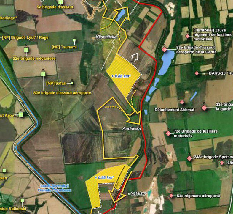 ‼️ On the southern flank of the Bakhmut sector, the Ukrainian Armed Forces continue to advance, pushing the Katsapnoys off our land. Thus, 0.88 km² south of Klishchiyivka and 0.88 km² north of Kurdyumivka were liberated yesterday. The Katsaps fled Klishchiyivka and are now being cleared out of the village. The Ukrainian army's offensive continues...