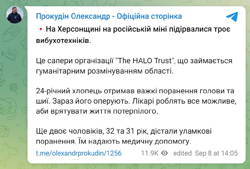 Three sappers of The HALO Trust, an organization engaged in humanitarian demining in the Kherson region, were killed by an enemy mine