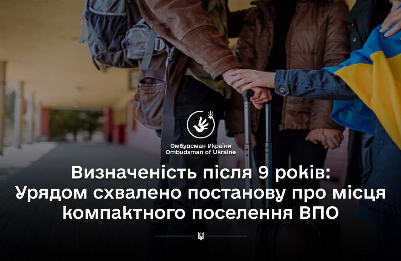 Сьогодні Уряд України ухвалив важливу постанову щодо утворення та функціонування місць компактного поселення (МКП) для внутрішньо переміщених осіб та визначив мінімальні стандарти проживання в них, - повідомив Уповноважений Верховної Ради з прав людини Дмитро Лубінець.