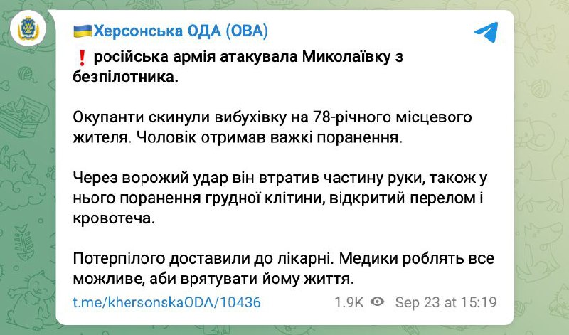 Russians dropped explosives from a drone on a 78-year-old man in Mykolaivka, Kherson region. He lost part of his arm, has a chest wound, an open fracture and bleeding, OVA reports.