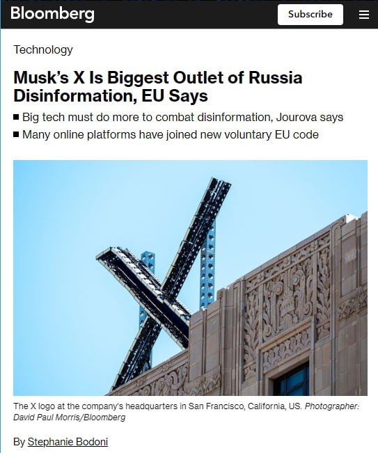 ▪️ В Єврокомісії вважають "X" Ілона Маска найбільшим джерелом російської дезінформації серед популярних соцмереж